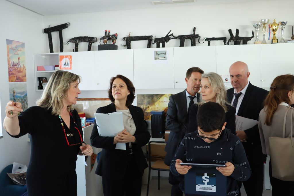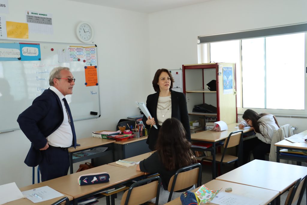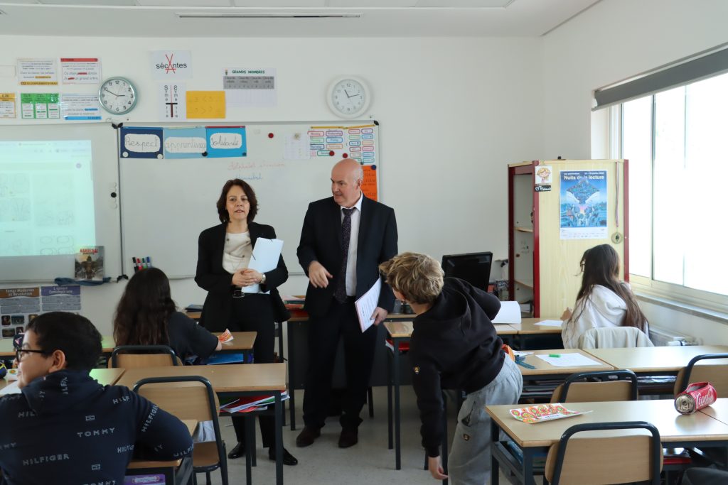 La délégation s’est ensuite dirigée vers le Bâtiment N, livré fin 2023 et conçu pour un confort thermique optimal. Dans la classe de CM1 de Mme Mabrouk, l’innovation était à l’honneur. Les élèves ont présenté un projet immersif sur Carthage en réalité virtuelle et augmentée.